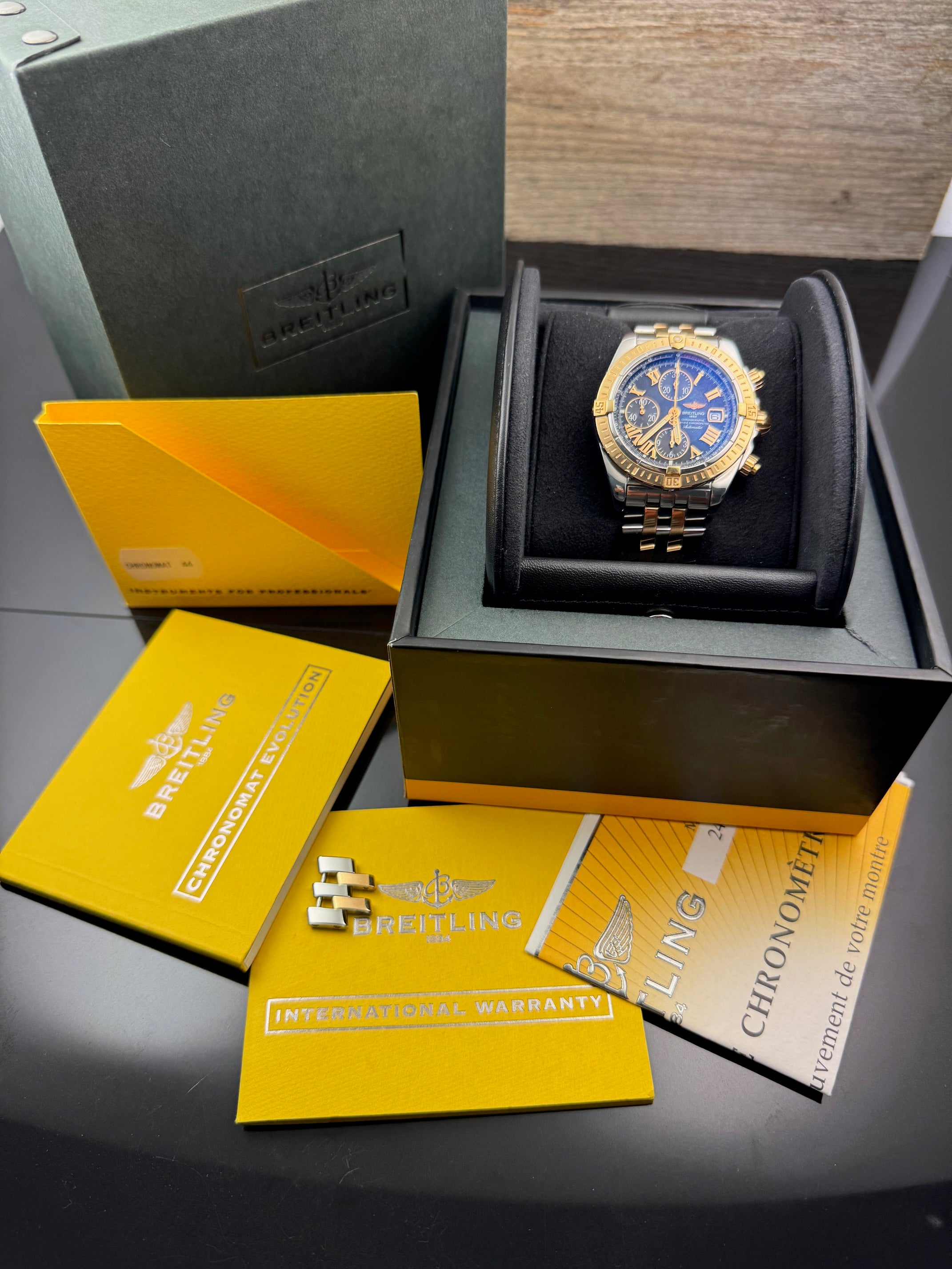 An alle Freunde des guten Geschmacks, angeboten wird ein sehr schöner Breitling Chronomat Evolution 44 Chronograph Reverenz C13356 in Stahl / Roségold mit einem top Stahl / Roségold Armband aus ca. dem Jahr 2009 im Full Set!