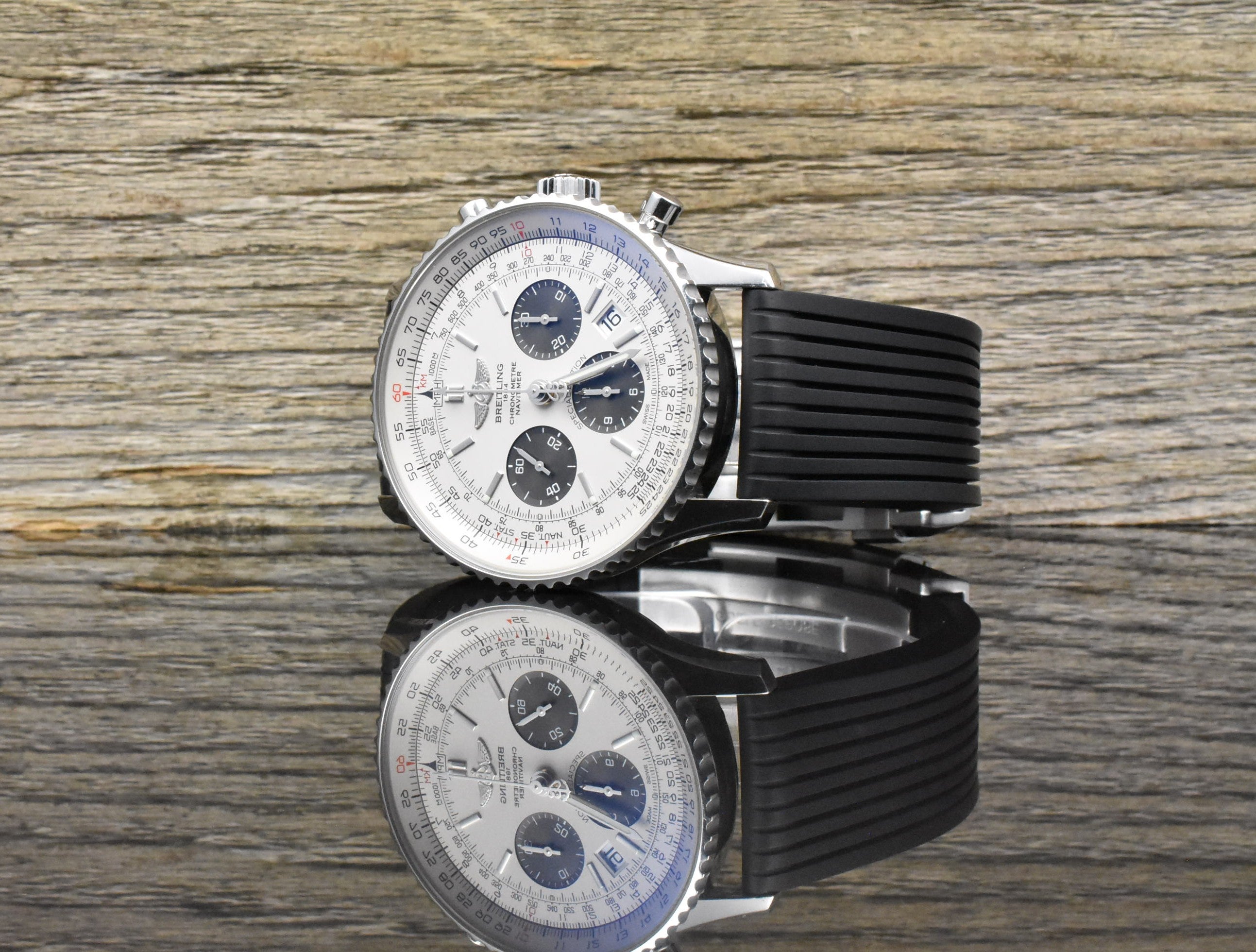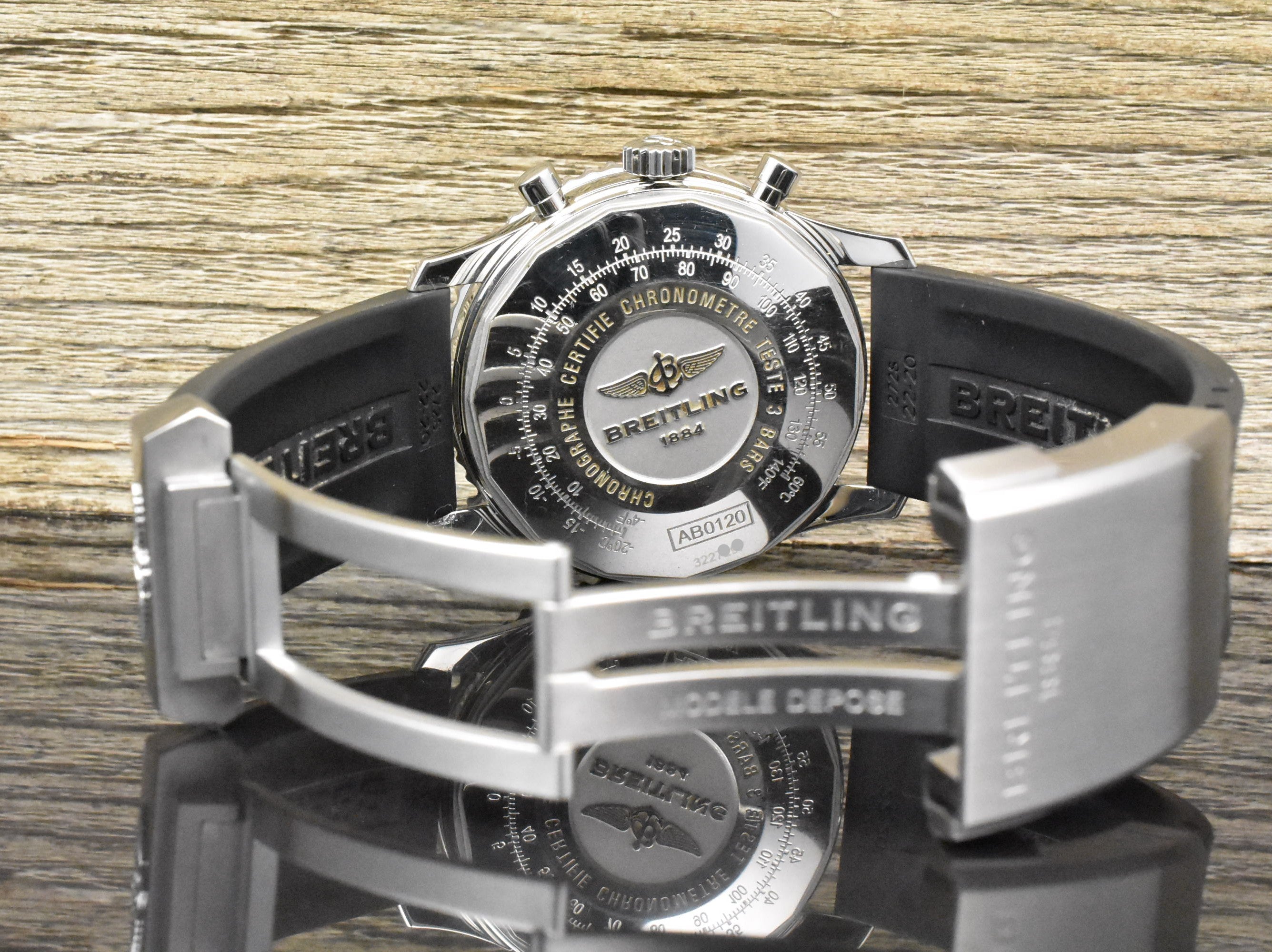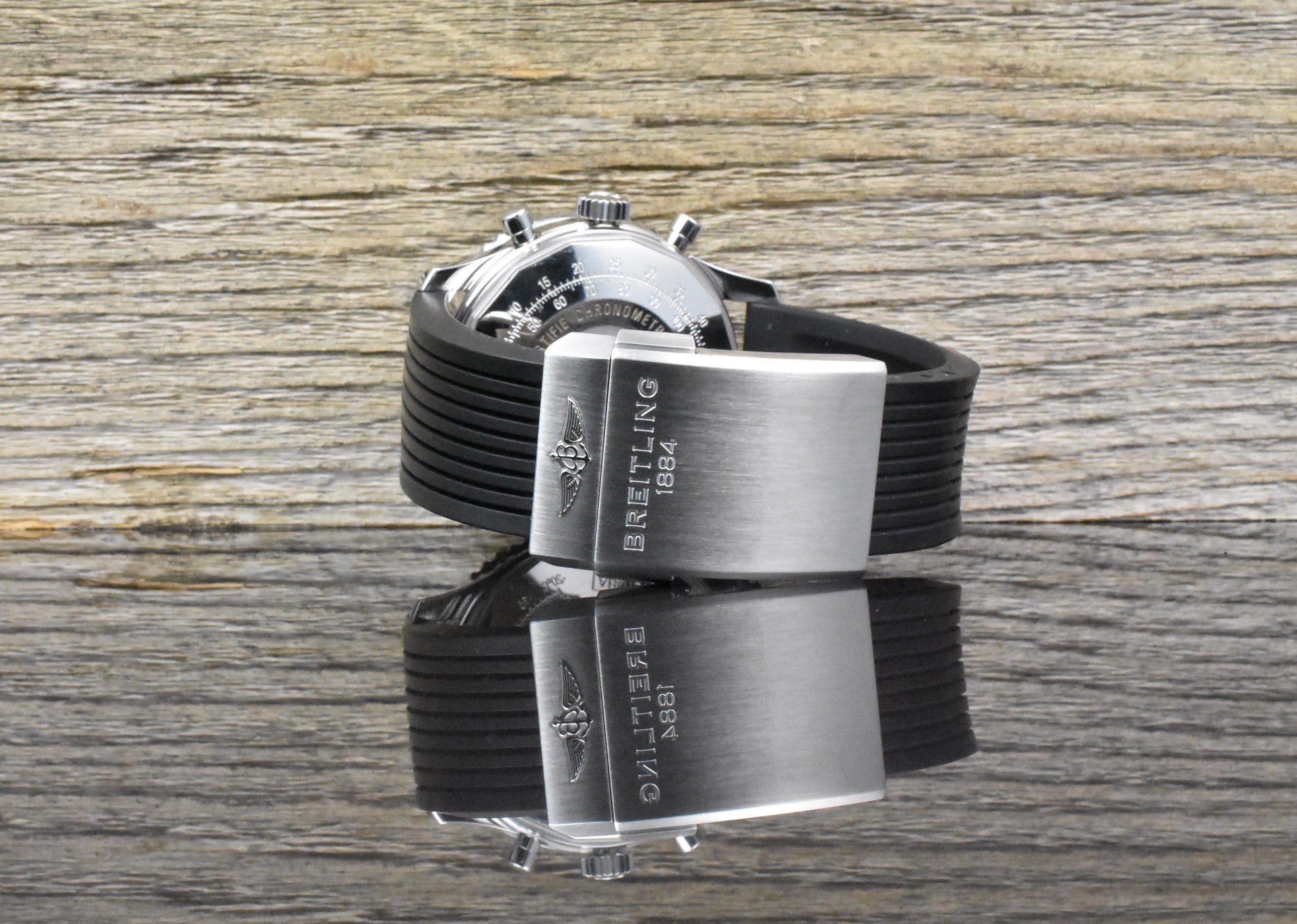 Lieferumfang: Breitling Box mit Überkarton & Garantie Zertifikat aus dem Jahr 2018, Chronometer Zertifikat, Gebrauchsanleitung, Rechenschieber, Anleitung Rechenschieber und drei Breitling Booklets