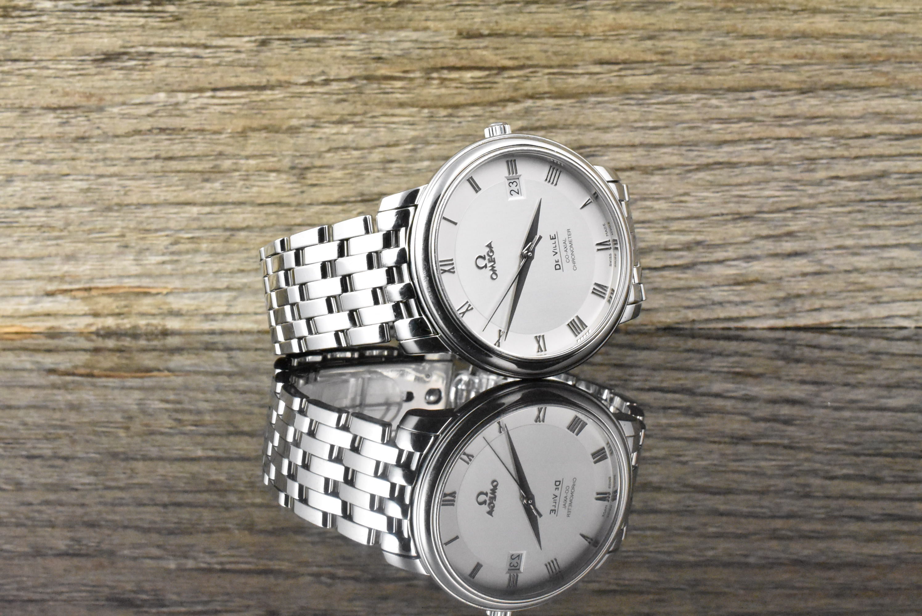 An alle Freunde des guten Geschmacks, angeboten wird eine schöne unpolierte Omega De Ville Prestige Co-Axial 37MM Silver Referenz 4574.31.00 am Stahl Armband aus dem Jahr 2012 mit Box & Papieren!
