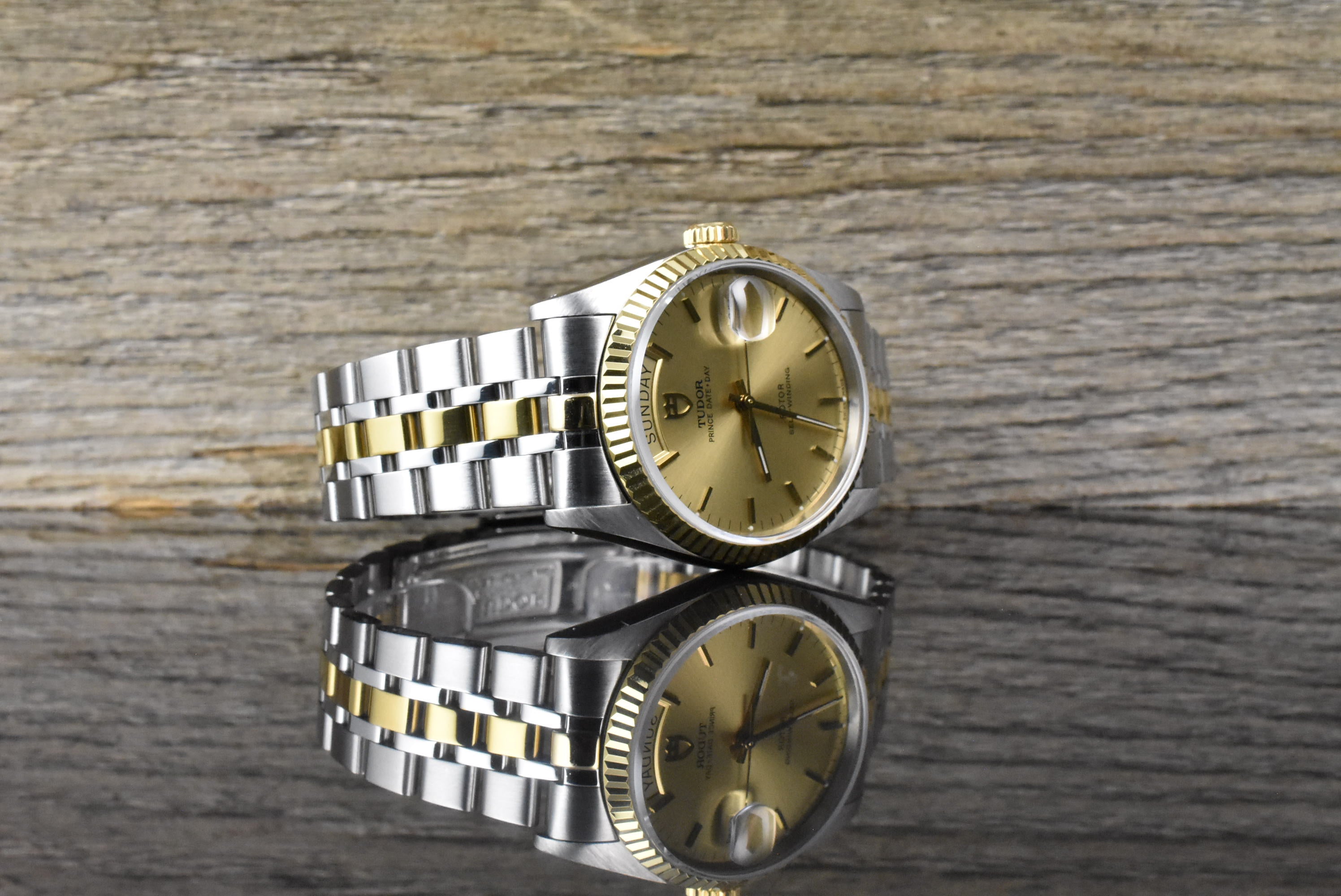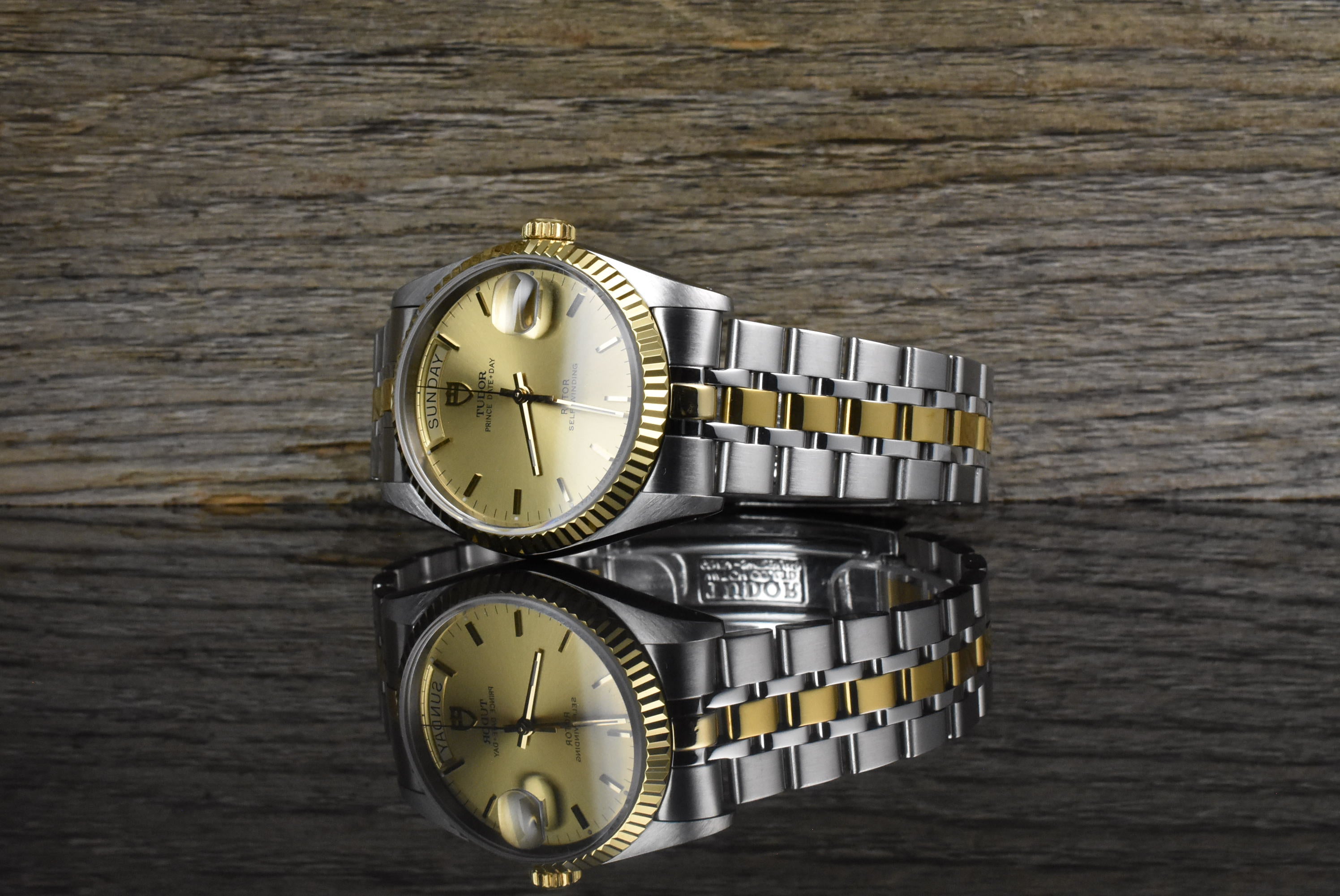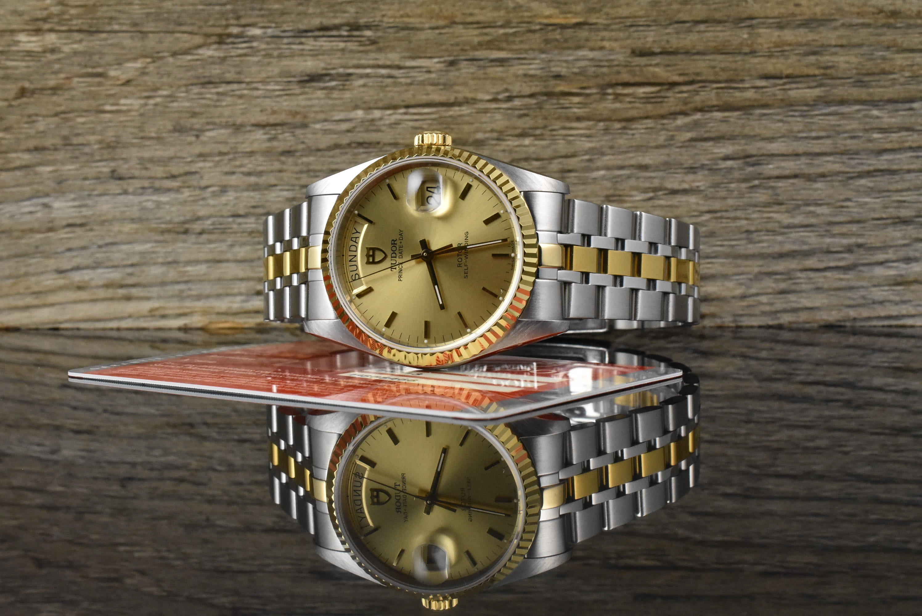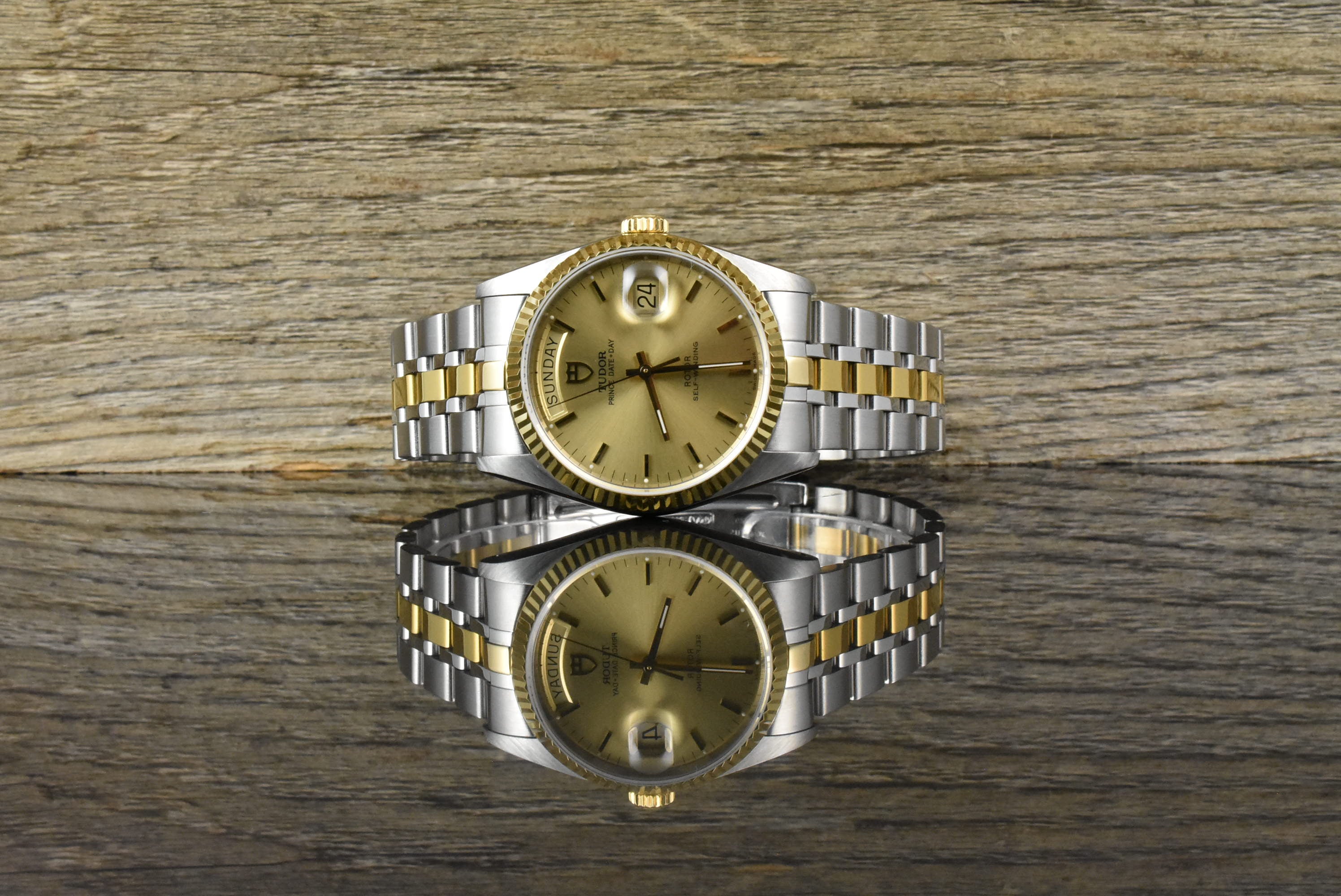 An alle Freunde des guten Gesch9macks, angeboten wird eine sehr schöne Tudor Prince Date Day Reverenz 76213 in Stahl / Gold mit einem edlen goldenen Ziffernblatt aus dem Jahr 2009!